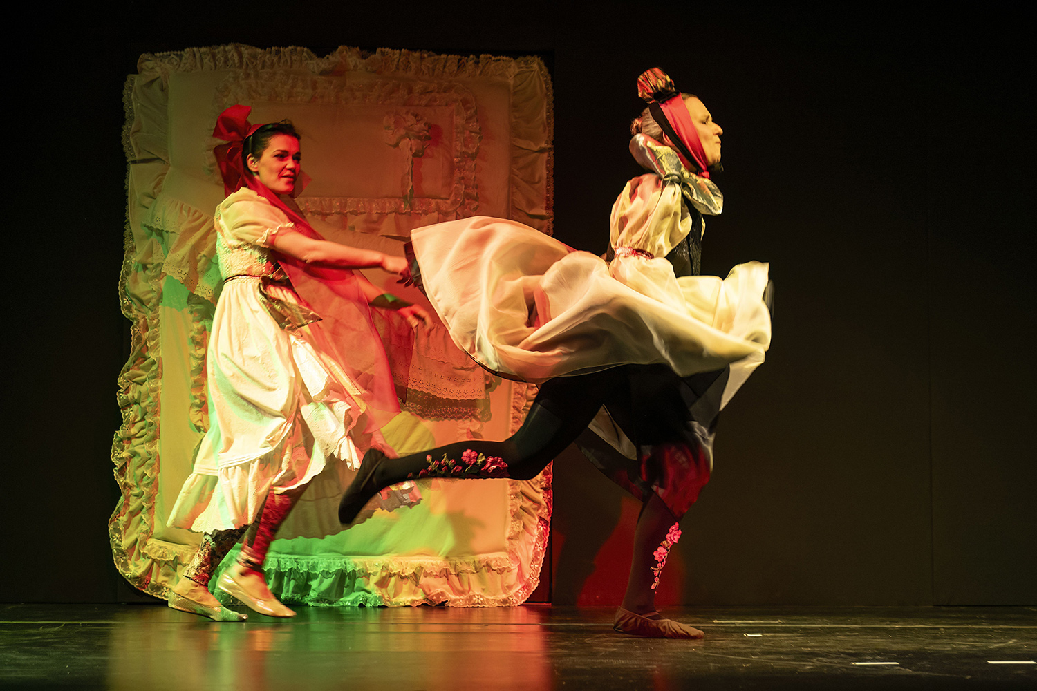 Welche Tanzlust greift da jede Nacht um sich? Laute Musik und fröhliches Lachen dringen aus dem Zimmer der Töchter, doch sie lassen niemanden hinein. Der König hat drei Herren beauftragt, eine Antwort zu finden. Tatsächlich öffnet sich für sie die Tür zwölf Mal, und zwölf Töchter stellen sich vor. Jede anders, jede geheimnisvoll. Jede mit ihrer Musik und ihrem Tanz. Zusammen verwickeln die Zwölf ihre Herren in immer ausladendere Tänze…