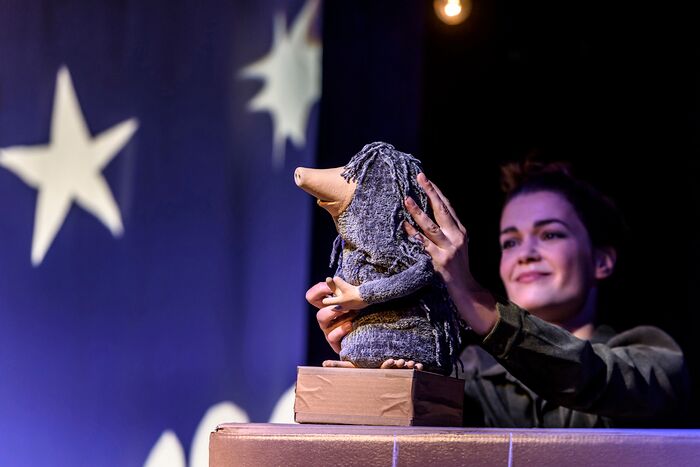 „Tierische Briefe“ erzählt vom Briefeschreiben; das Eichhorn schreibt Briefe an die Ameise und übergibt sie dem Wind zum Versenden. Der Sperling unterrichtet die Tiere im Schreiben, der Maulwurf schreibt Briefe an sich selbst. Der Elefant bittet die Schnecke schriftlich um Erlaubnis, auf ihrem Haus tanzen zu dürfen – ganz vorsichtig natürlich. Das Glühwürmchen kann sich nur dem Nachtfalter verständlich machen. Und die Blattlaus entrinnt nur knapp ihrer Einsamkeit. Toon Tellegens kurze Geschichten sind utopische Miniaturen über Empathie und Gemeinschaft. Der Regisseur, Puppengestalter und Puppenspieler Frank Soehnle – bekannt für seinen unverwechselbaren Stil und seine fantasievollen Figuren – erzählt mit seinem Team in diesem Stück ab 14 Jahre auf absurde und komische Weise von den verschlungenen Wegen der Kommunikation, vom Wunsch nach Verbundenheit und von der Leichtigkeit und Schwere von Begegnungen.